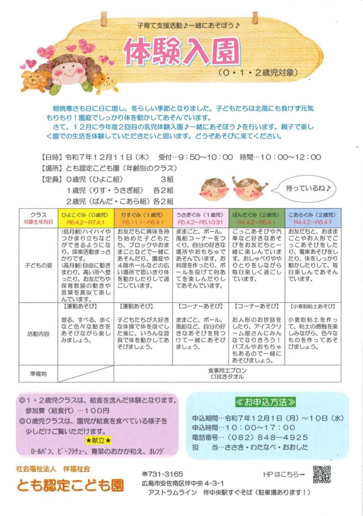 令和7年度 乳児体験入園(後期)のご案内