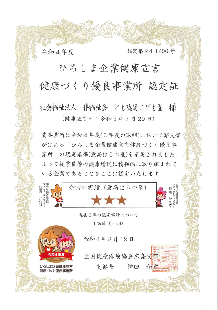 全国健康保険協会広島県支部様より、当園の令和3年7月29日からの健康への取組状況について評価を頂きました。今後も継続して職員の健康増進について努めてまいります。